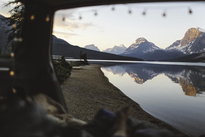 a cozy morning view from the back of my subaru on a lake in Banff, Alberta.