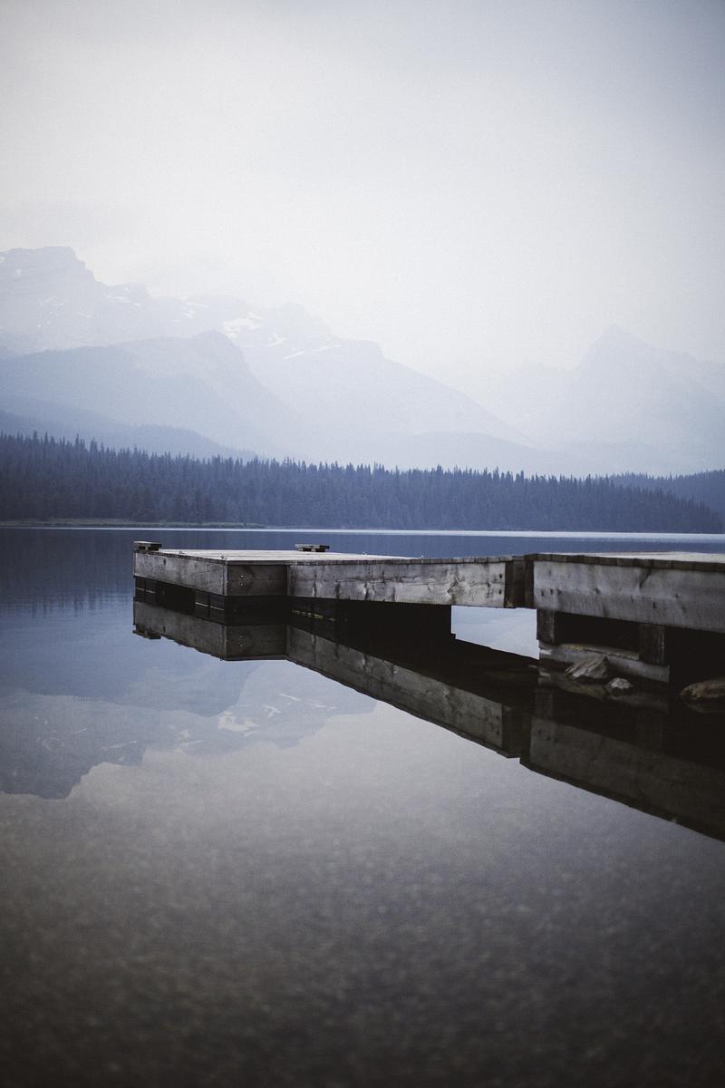 Woke up to a gloomy morning on Maligne Lake, with peaceful waters and distant fog.
